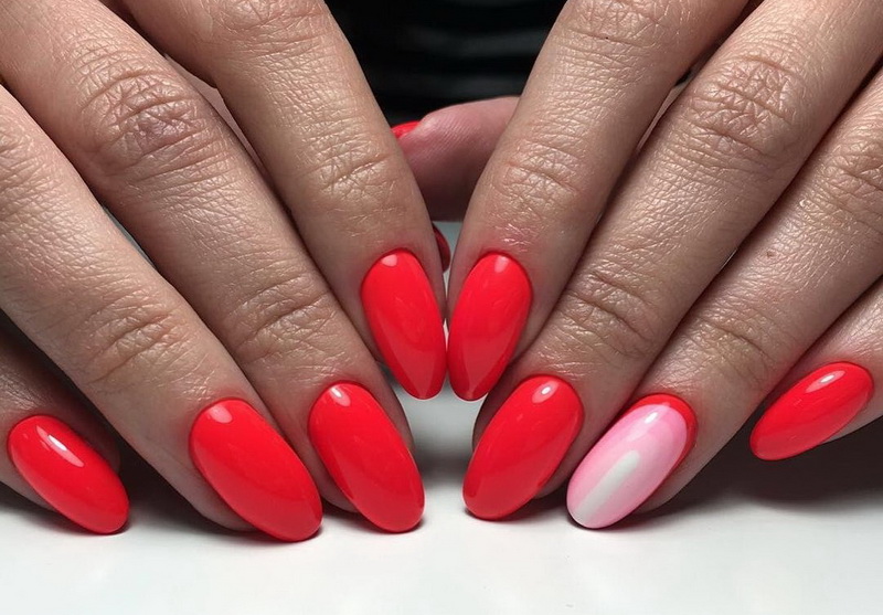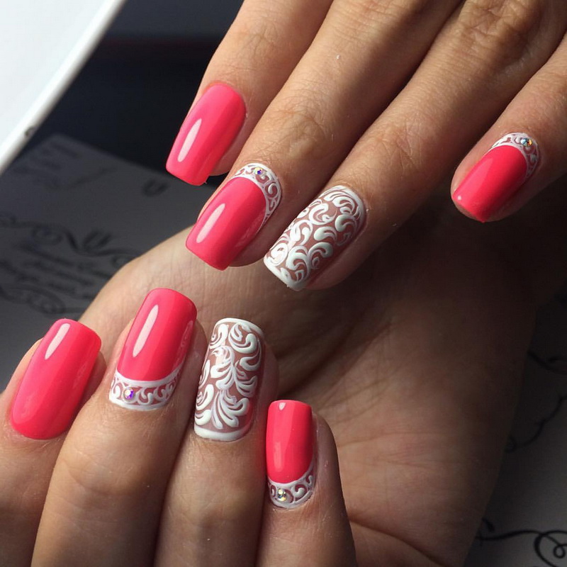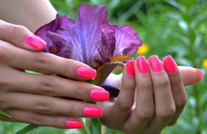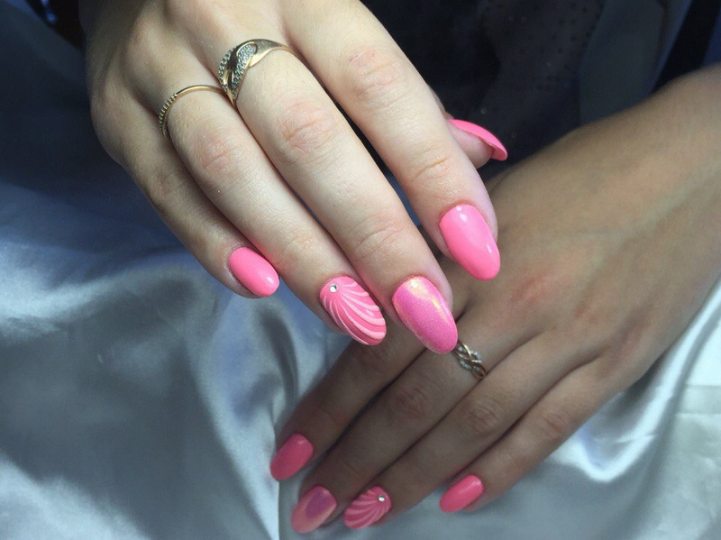 Pink lacquer can be used in different methods of nail design. In this case, even the brightest and juicy tones can be given a softer perception, so that they do not outweigh the bow, but complement it, giving expression.