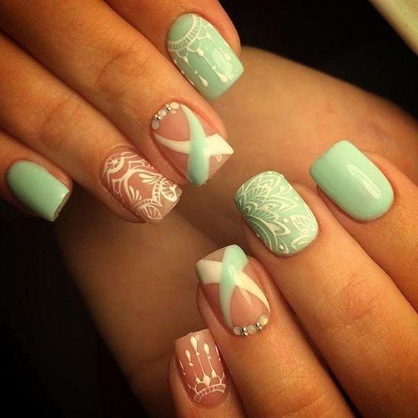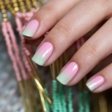Green is associated with nature, delicate greenery and a feeling of freedom and tranquility. And pink is the color of tenderness and romance, fragrant flowers and clouds at sunset. Together, they form a kind of light tandem, tuning in a good mood. Therefore, for work, where there is a strict dress code, such a coating of nails is not very appropriate.