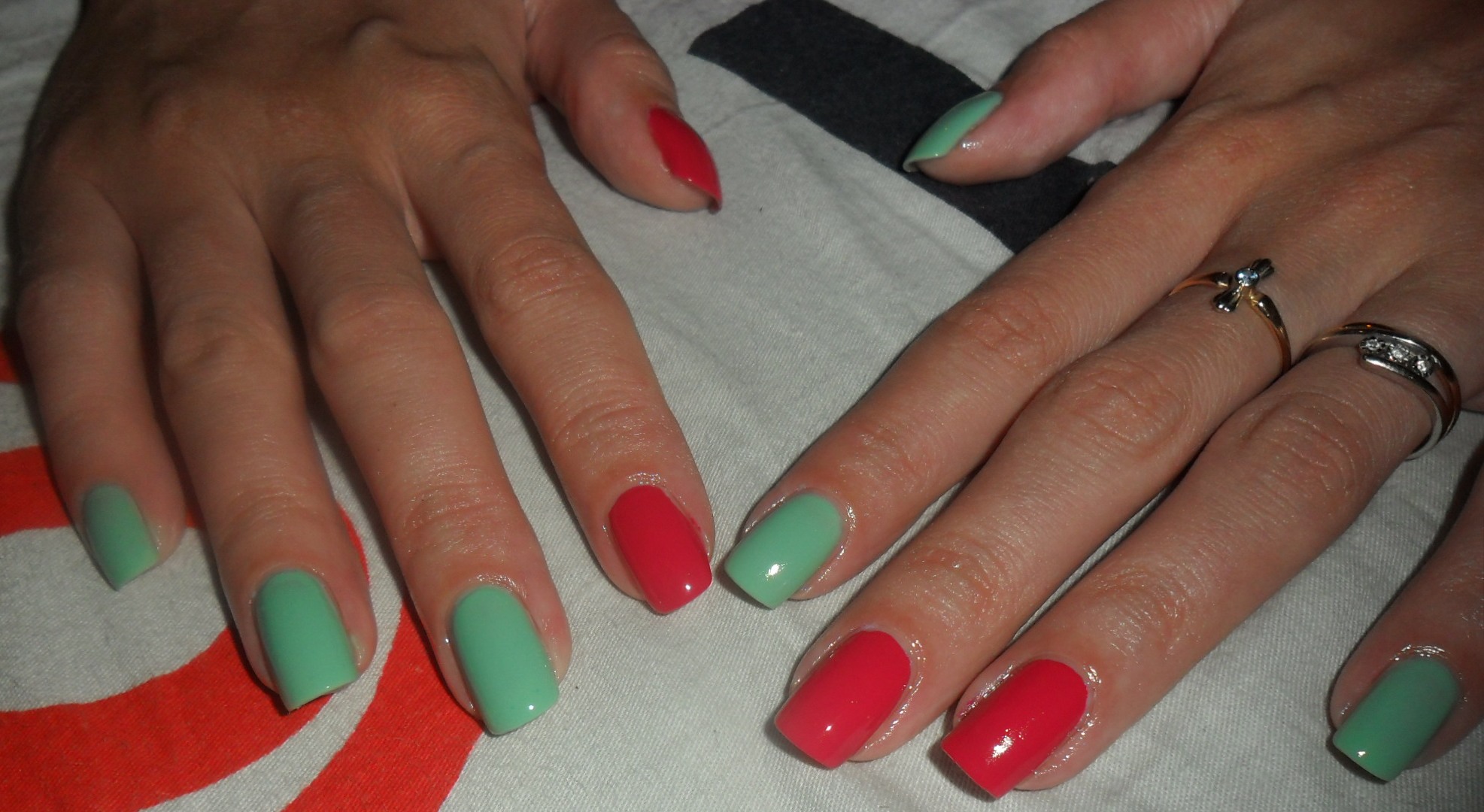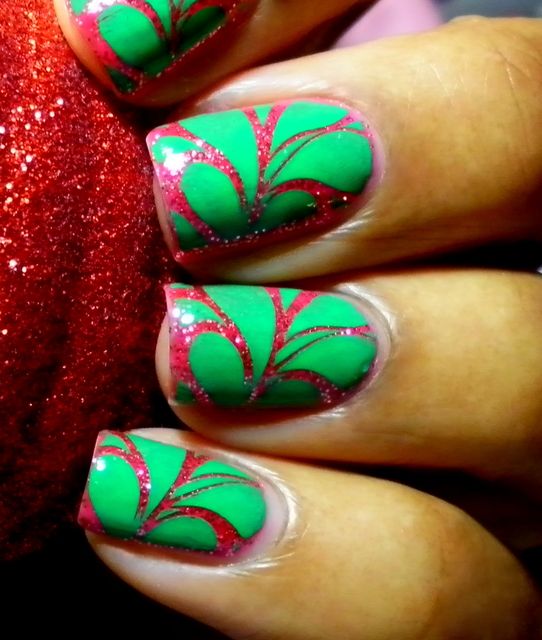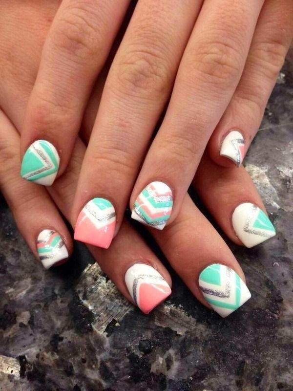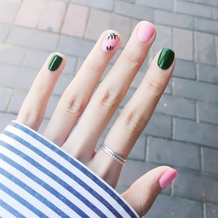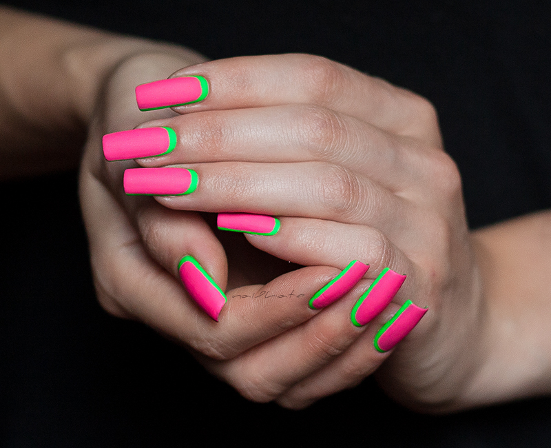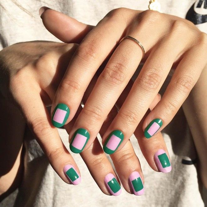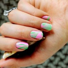 - Stripes. The alternation of pink and green stripes, possibly of different widths, looks very fun and creative, especially on short and square nails.