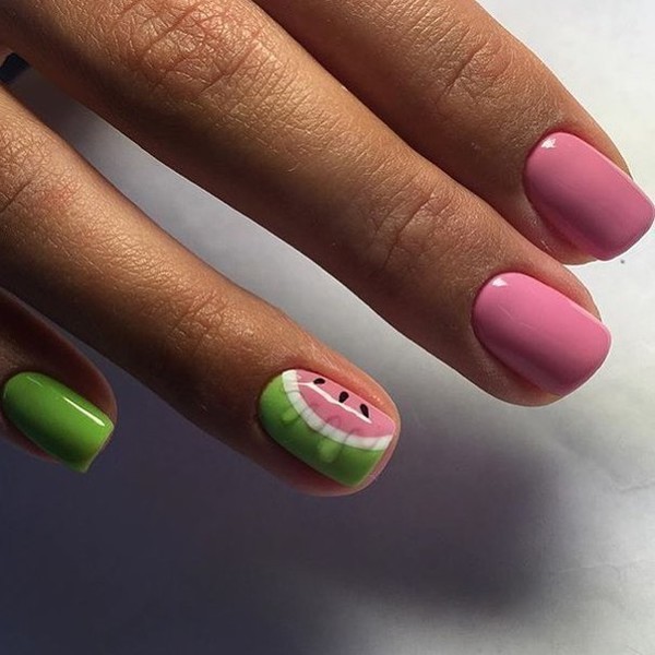 - Fruits and vegetables. Pink watermelons and tomatoes can be a real masterpiece if the master depicts them on your nails as realistic as possible.