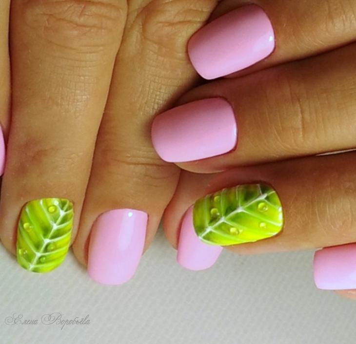 - Vacation Regardless of where the owner of the fashionable nail design goes, this color will perfectly beat the situation. Summer trip to the sea: against the background of flowering trees and majestic palm trees, pink with green lacquer will look very harmonious. Winter holidays with your family or a holiday at a ski resort - a cheerful color manicure will be a small additional piece of positive.