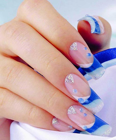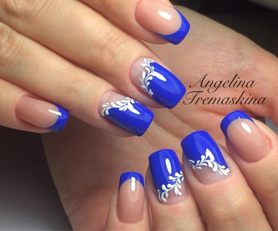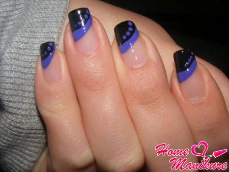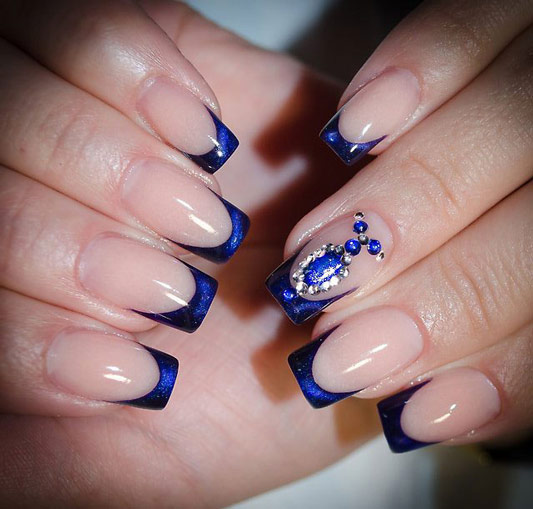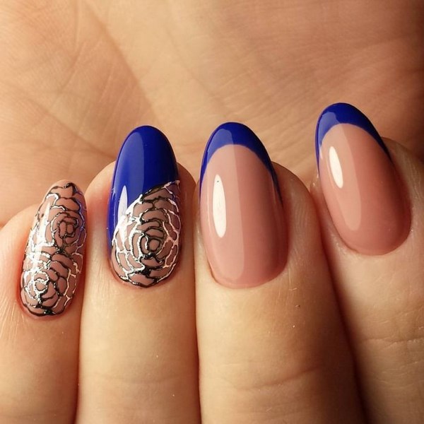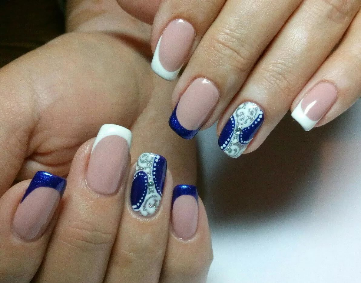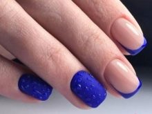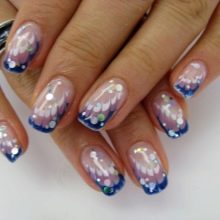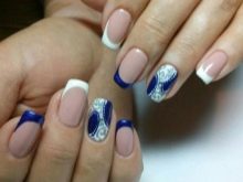 It looks great blue jacket with techniques such as veil, broken glass, powder, gradient. Each of them, decorating the accent nail of the French manicure, brings a special mood to the design. However, it may vary depending on the selected colors. For example, the design in a white and blue gamut looks soft, black color together with silver brings a certain solemnity to the design of nails.
