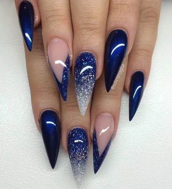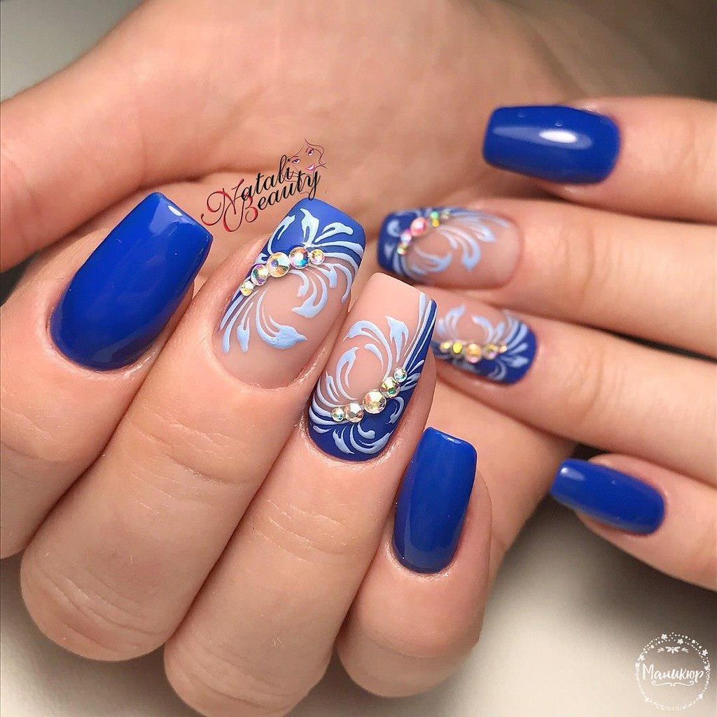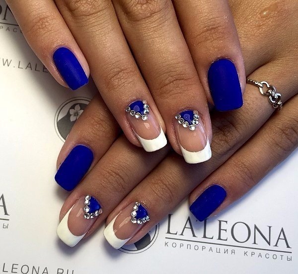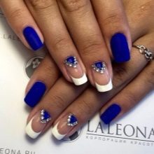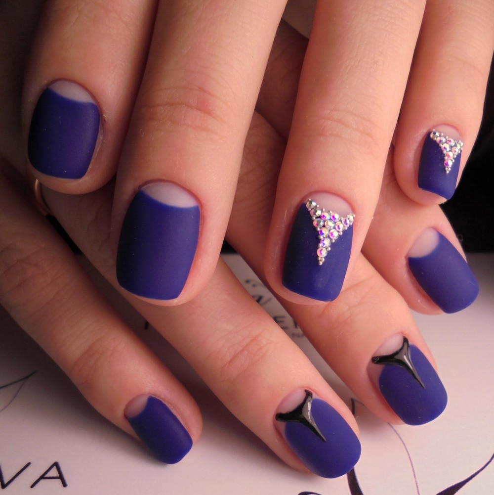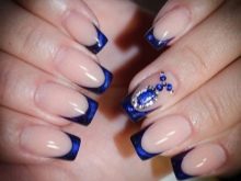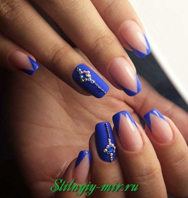 So that the jacket in blue does not lose its nobility, it is worth considering not only the choice of varnishes, but also the number and location of the decor. For example, when choosing a design with a pattern, it is important to pay attention to more successful places for fixing sparkling decor. Sometimes small stones are not needed at all, and they are best left to other options.