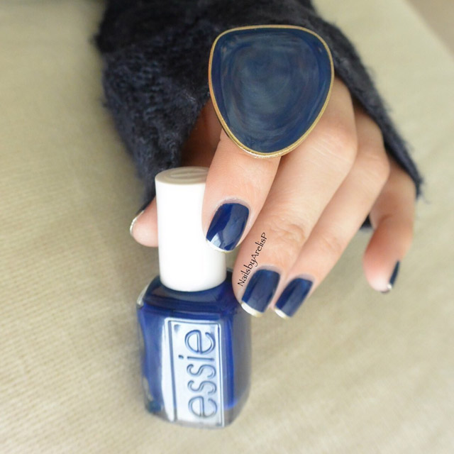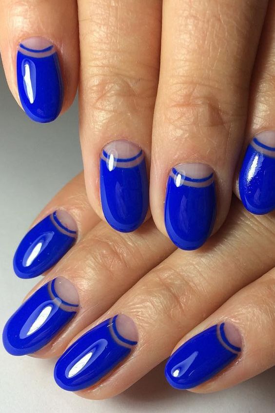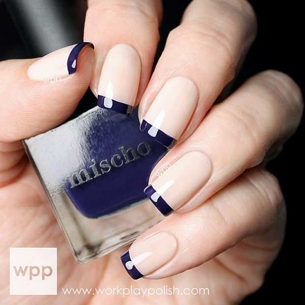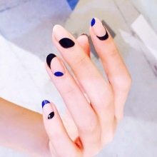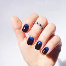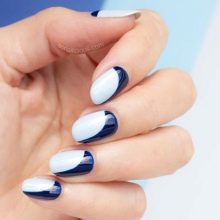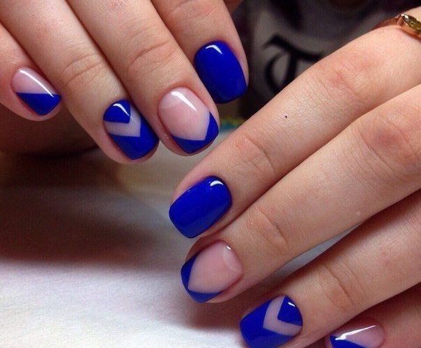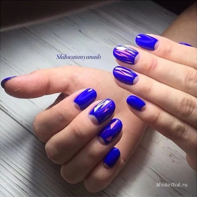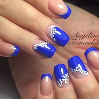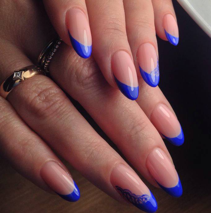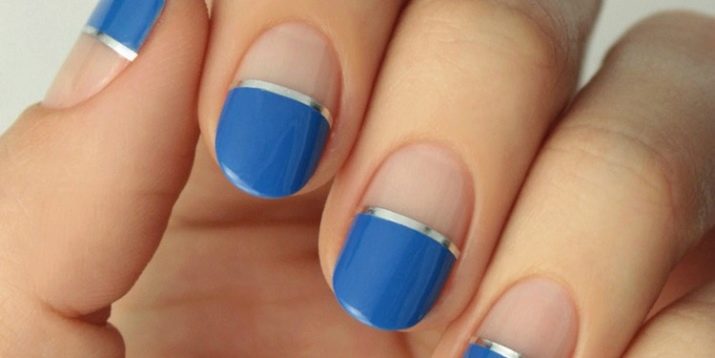 Depending on the style of manicure, different experiments are allowed. At the same time, not only traditional, but also flipped jacket is remarkable. It is often decorated with a deliberate underlining of the cuticle area, which looks especially beautiful and spectacular against a blue background. In addition, the reverse French manicure is notable because it is he who today more often than other techniques allows you to embody geometric patterns that are considered the most fashionable today.