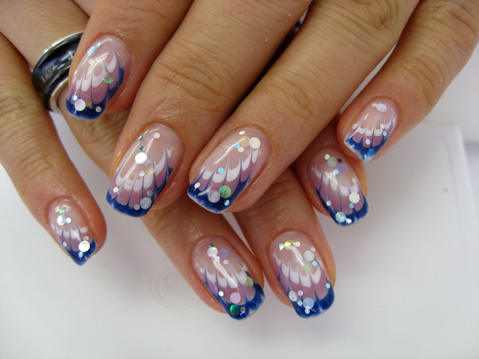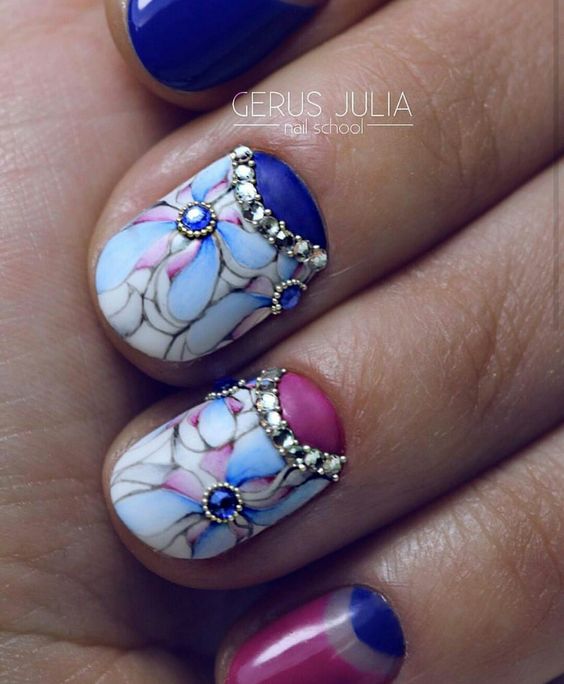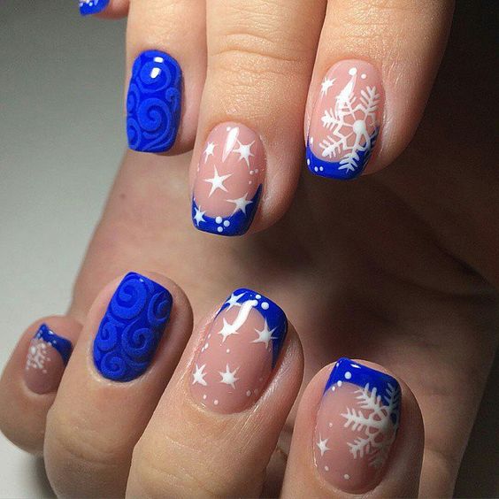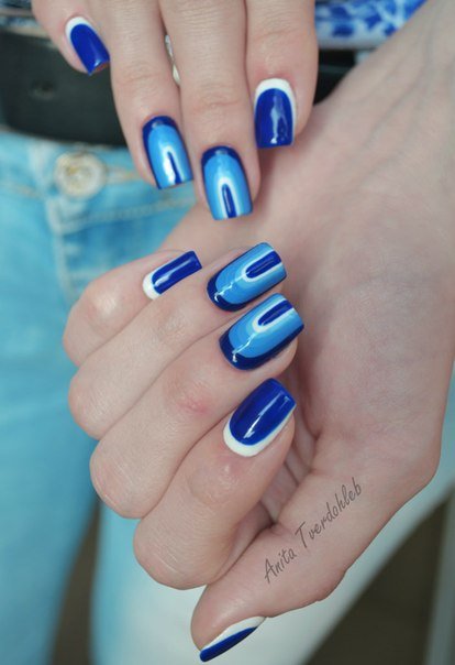 - beautiful manicure with a pattern that softens the perception of blue;