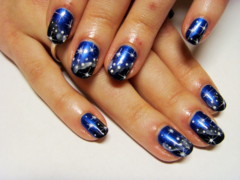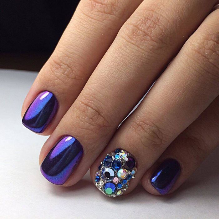 If the design is built on a solid or white base and a blue smile, then the background color can be slightly sprayed with pearl pollen. From this, the design will only benefit, and rubbing even better pearlescent varnish will change the appearance of the background pigment. If the jacket has an accent nail, painted completely over the entire area, it is possible to treat it rubbed. Longer rubbing powder in a bright or dark blue color, you can get a unique type of texture.