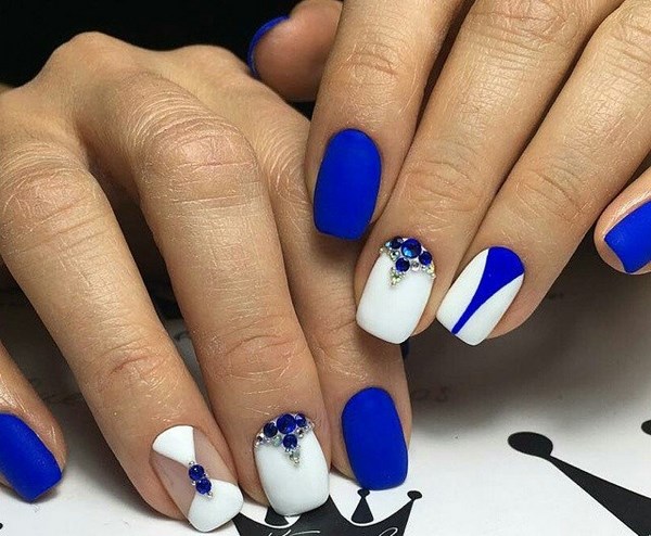 As decoration nail plates should take only sparkles and rhinestones. It is quick and simple to make a manicure with such decorative elements, therefore, the owners of short nails were lucky. Blue matte manicure is ideal for this type of nails. The design looks aesthetically and beautifully.