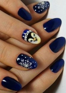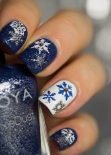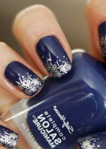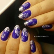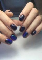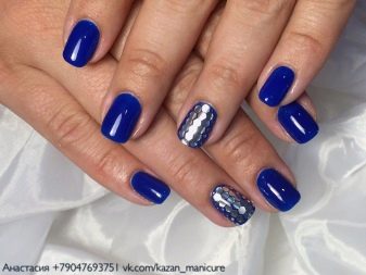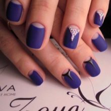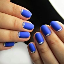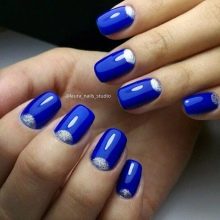 The simplest design is a moon manicure, where the main coating is made of sapphire or indigo, and the hole is lined with silver. The combination of the same colors on different fingers looks spectacular - four are covered with silver lacquer and the rest are azure.