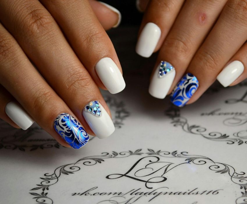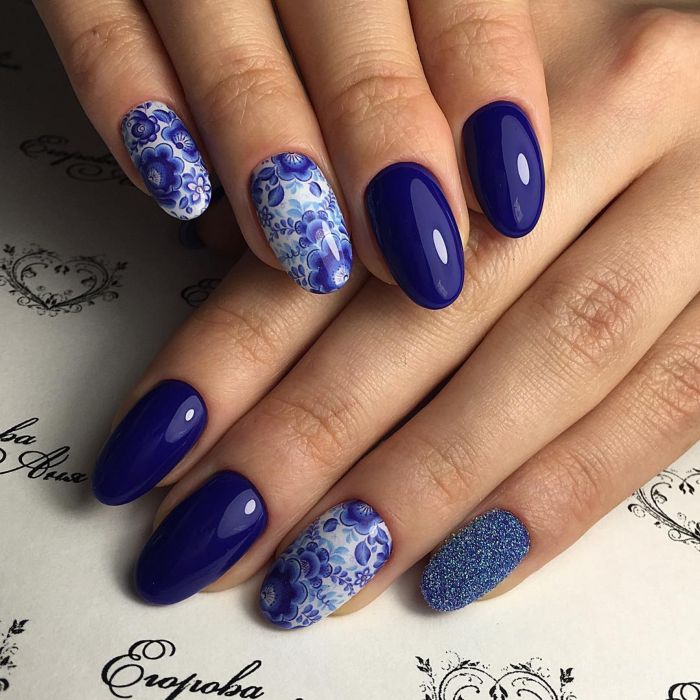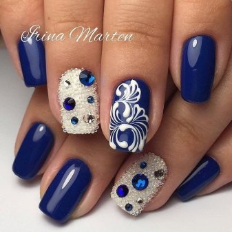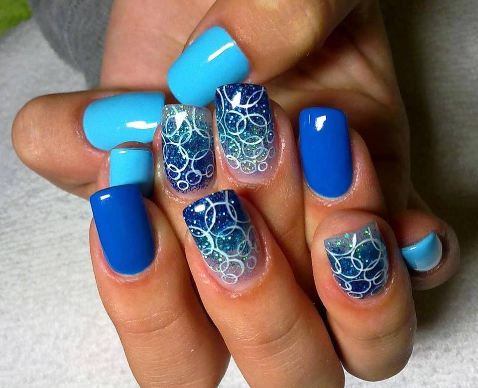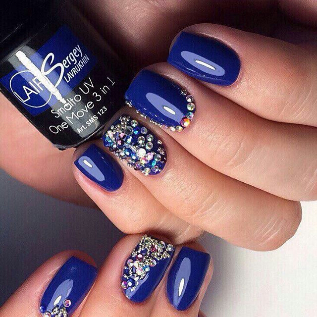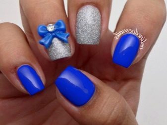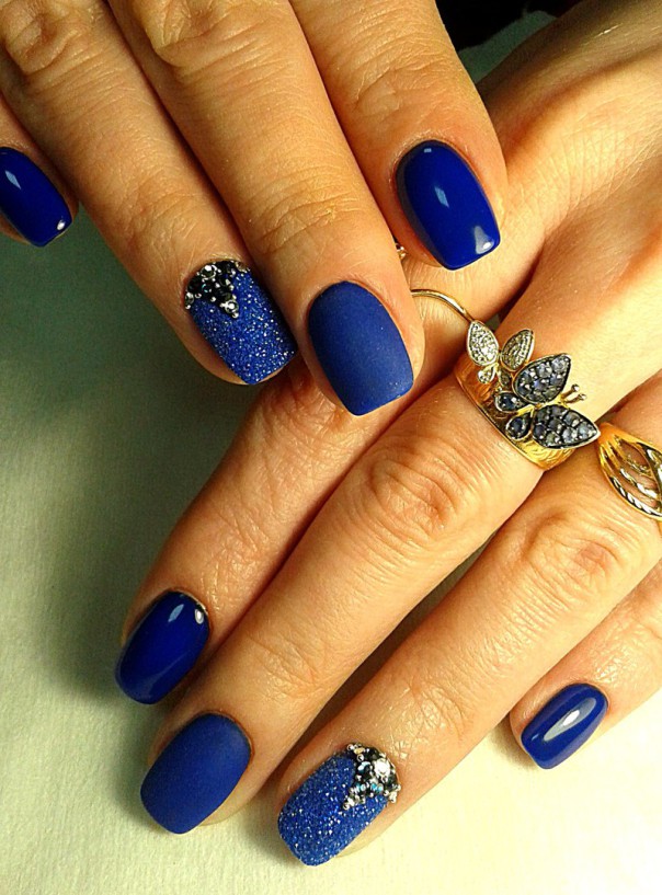 The blue color in all its manifestations (except the most pastel) is well combined with other colors - red, white, yellow, black. Silver and gold give luxury and sophistication to design with soloing shades of the sea and sky. In addition, rhinestones, kamifubuki, modeling and sand look great on blue.