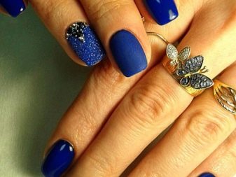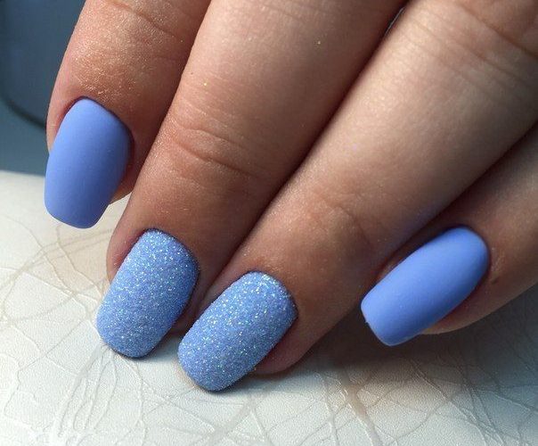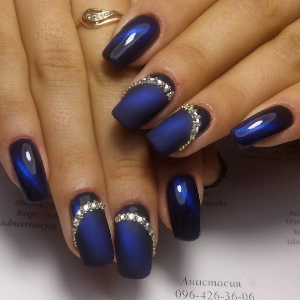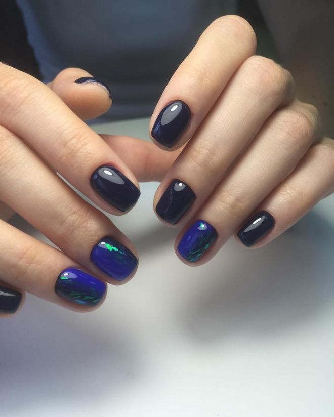 Pungent "broken glass" or silver foil will attract additional attention to the hands. The combination of matte and glossy coatings, so popular nowadays, looks great on blue lacquer.