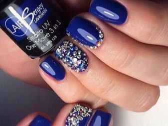 It is on the deep shades of blue and green that designs with rhinestones look most impressive, but even the largest of them do not look excessive. If the abundance of stones for you is too much, you can cover part of the nail with sparkles. Such a manicure will look more restrained, but at the same time elegant.