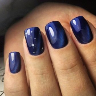 Blue cat-eye manicure looks very impressive. It can act as a solo, and be the basis for the implementation of monograms, calculations of rhinestones, beads, all sorts of patterns.