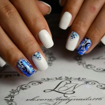 And, of course, “Gzhel” is an original design, a combination of bright blue and white, into which minimal splashes of silver sparkles will perfectly fit.
