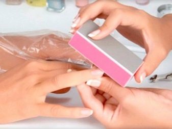Manicure usually begins with a thorough degreasing and disinfecting of the plates, as well as treatment of the skin of the hands. Then you should give the free edge the desired shape, remove the buff all detachments from the surface of the nail. If you choose the P. Shine set, then in this case use a double-sided sanding pad with different degrees of abrasiveness of the sides. So, pink is used to carefully remove all existing detachments, and green - to polish the edge of the nail. If you are dealing with Masura, then you will need to separately purchase files of the same manufacturer.