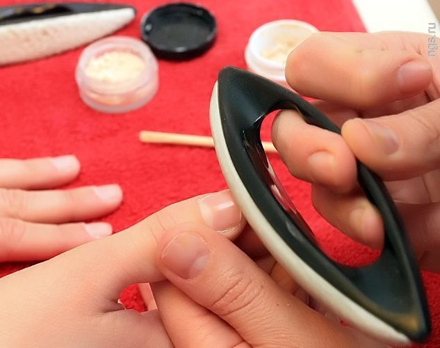 At this stage, the nails become dense and strong, but the hand care procedures do not end there. - it is necessary to fix the effect.To do this, apply glossy dust on your nails, distribute it with a special buff to sharp movements in various directions. Such dust contains wax and effectively seals marigolds for a couple of weeks. Such protection does not dissolve in a hot liquid, does not lose its resistance under the influence of alcohol, as well as chlorine and weak acid-base solutions.
