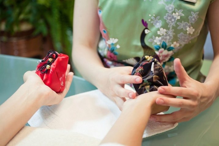 Japanese manicure technique involves another important step - with a special desire, each woman can pamper the skin of the hands with an additional massage. This final touch is designed to relax the woman and give her the most positive emotions. To this end, resort to massage with the use of cold or heated silk bags, which are called "atsui". They are filled with spicy herbs, salts and nutritious aroma oils. The salt impregnated by them keeps heat and coolness, and the herbs exude the most pleasant aromas, bringing a touch of charm and romance to the grooming procedure.