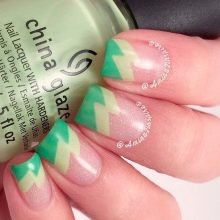 Especially stylish and unusual on the nails look different geometric shapes. As part of the green jacket, this option can be implemented in several ways. For example, apply a distinctive line on the end of the nail not oval or straight, but use geometric patterns (diamonds, triangles, parallelograms). You can also depict a geometric image in the center or another part of the nail.
