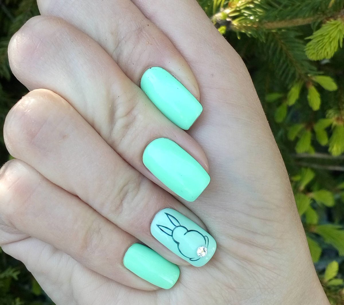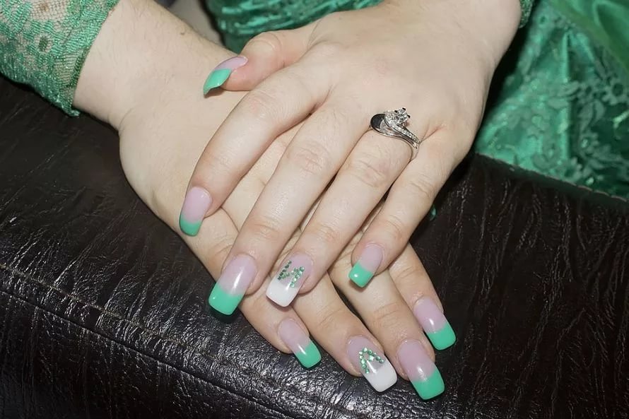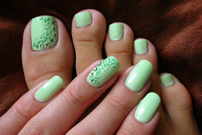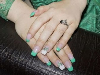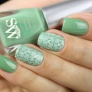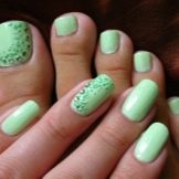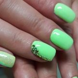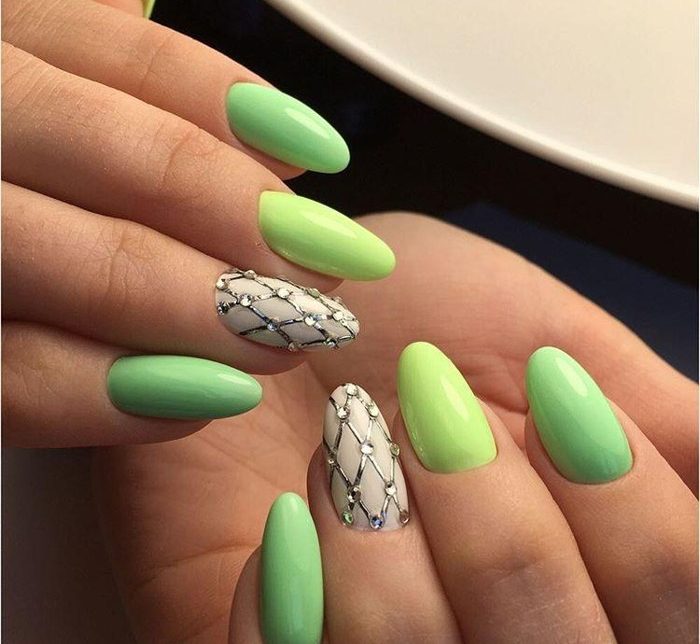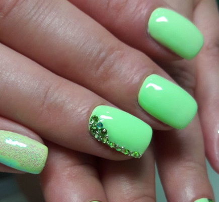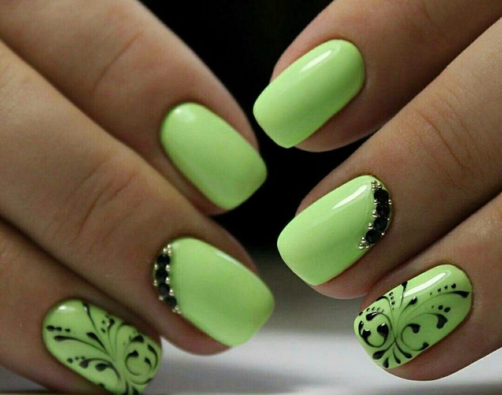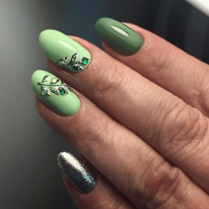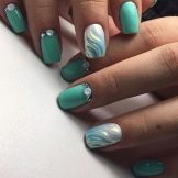 For lovers of bright and unusual manicure, you can add various decorations to a light green base. Such as rhinestones, glitter, unusual rubs (mirror, imitating fabric or nap). The original version will be special stickers that look like broken glass. To make the coating look stylish and modern, it is better not to get carried away, but to cover with such bright elements only a pair of nails on one hand. Rhinestones can be laid out randomly or take any particular form, the approach varies depending on the taste preferences of the future owner of such a manicure.