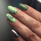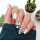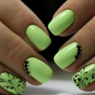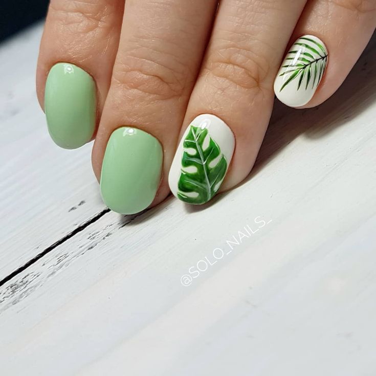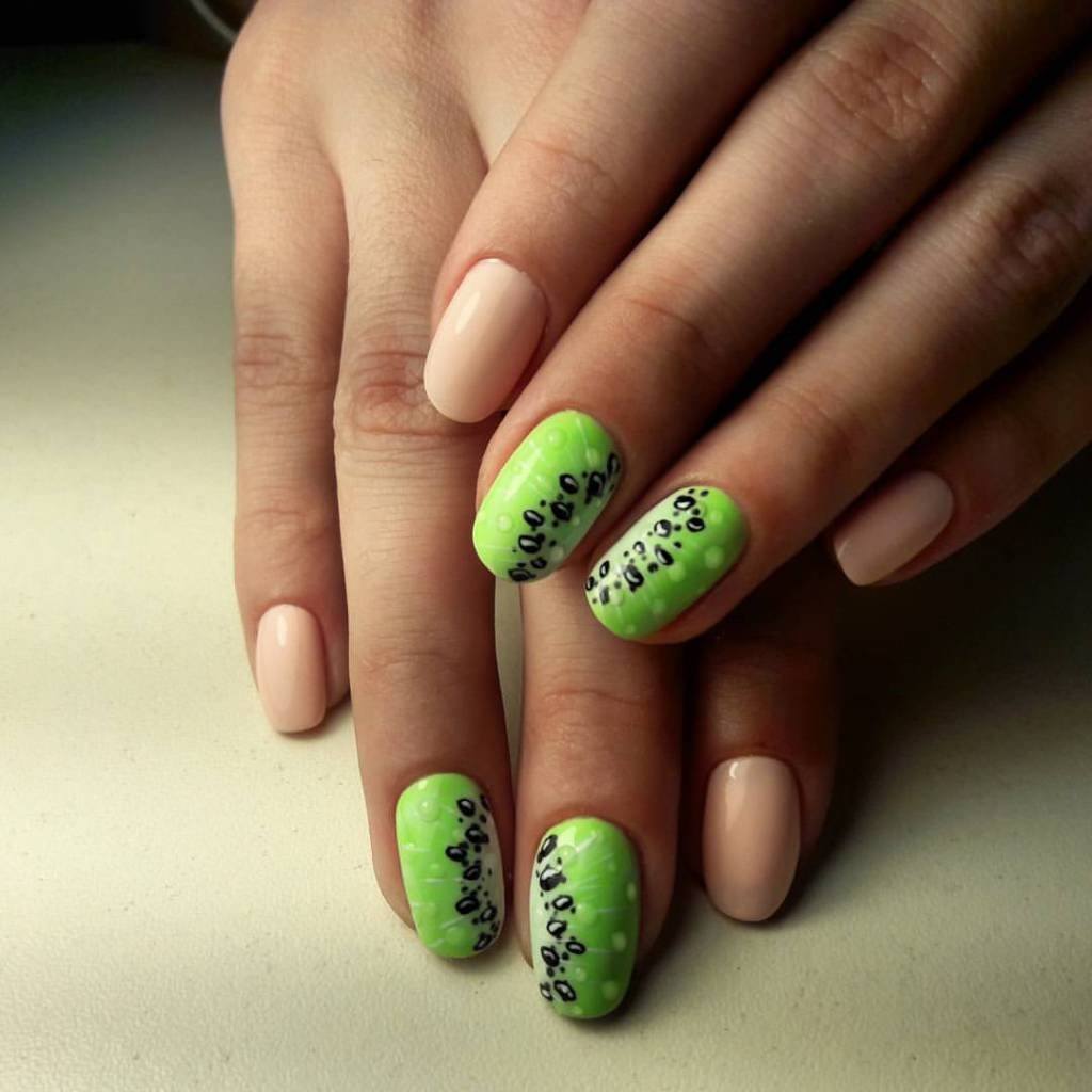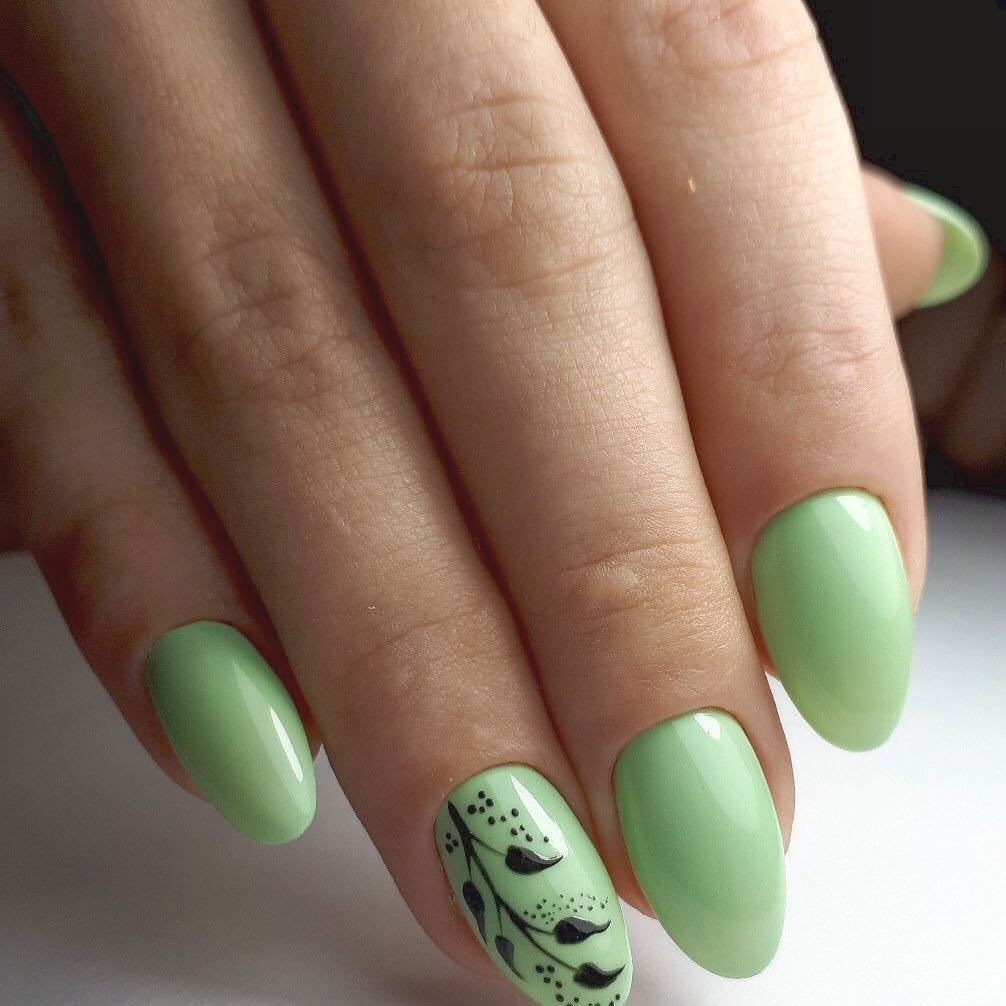 In summer and autumn it is especially important to use green colors in manicure to create various drawings on the theme of the plant world. So, on vacation, it will be appropriate to look at the images of tropical plants leaves, their inflorescences and branches, the delicate green kiwi looks amazing on a pair of nails. In the fall, you can decorate your nails with fruit prints and patterns. In this case, a light green or menthol color lacquer is taken as a basis, and selected drawings or special nail stickers are applied on top of it.