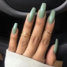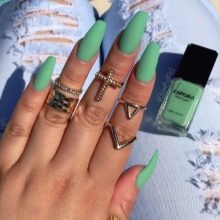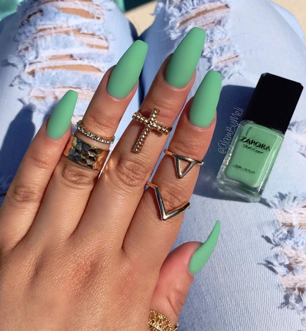 For lovers of simplicity and grace a matte manicure is a very fashionable option for covering the green color. Such a mint-colored lacquer looks amazing on short and well-groomed nails. This shade has been in trend for many seasons and is popular due to the fact that this color is quite subtle, suitable for any occasion, but at the same time unusual and pleasantly pleases the eye with its calm color scheme.