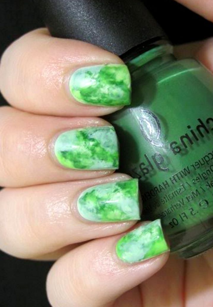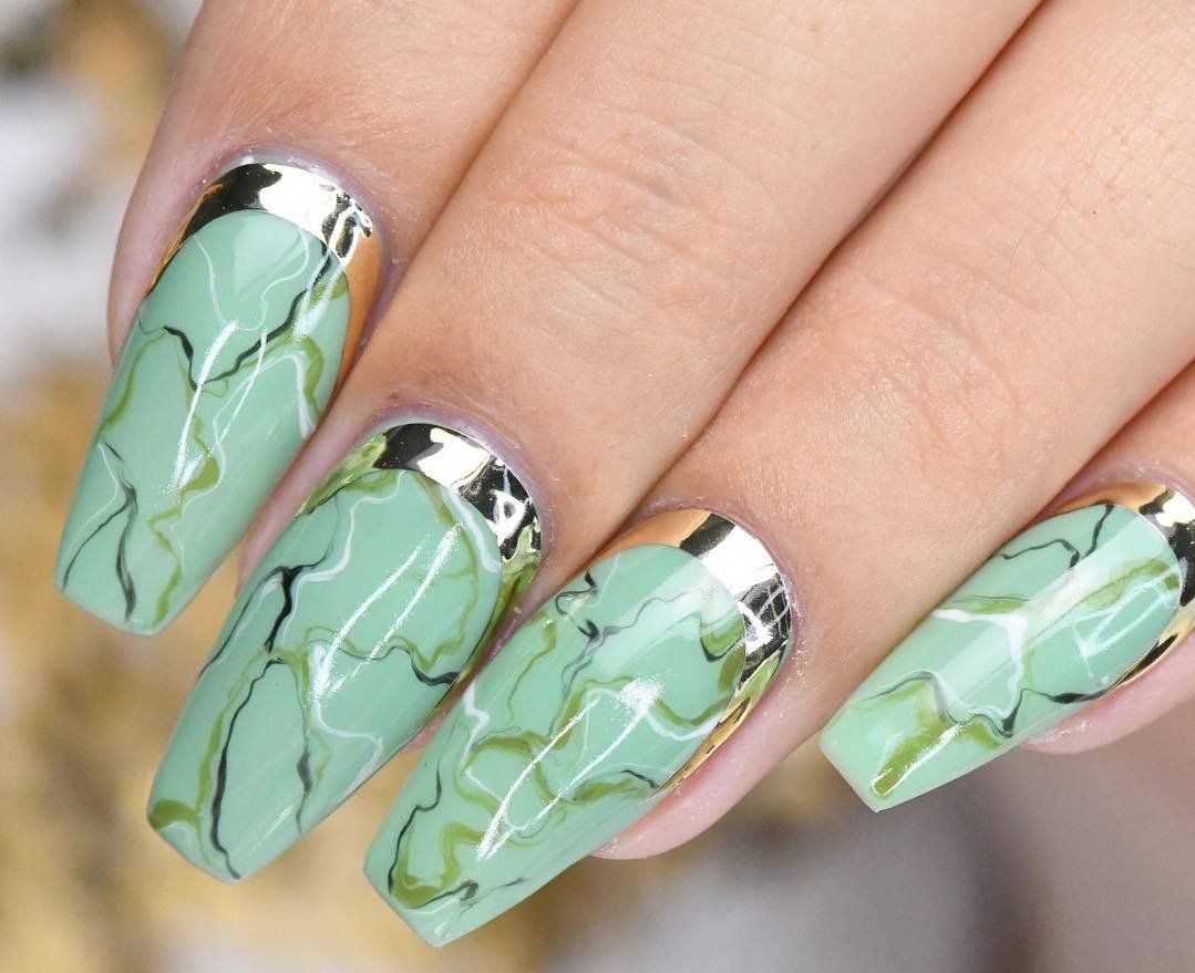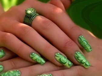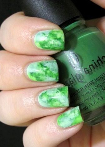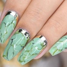 Now it is very important to use different versions of the so-called "marble" design. To do this, use the technique of water manicure and various rubbing. “Marble” nail in pale green colors is similar to such Ural gems as malachite and serpentine. An imitation manicure under the "cat's eye" looks interesting.