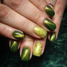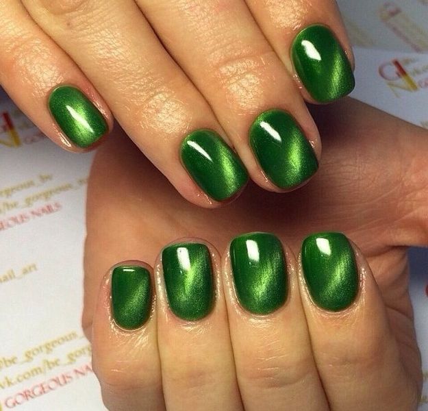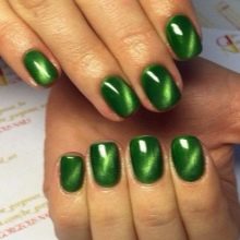 Now there are a lot of different green colors of this type of varnish: from menthol to dark green. They can be combined with each other and get a truly original appearance of the nail. Also, magnetic plates, with the help of which this technique is performed, can help to position the pattern in different ways: the different direction of the stripes, their number varies, as well as the shape of the glow.
