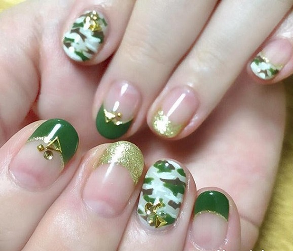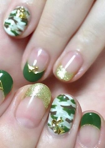 Often in combination with light green matte varnish, geometric patterns are used: stripes, squares, rhombuses.These elements may already have a shiny metallic finish or edging.