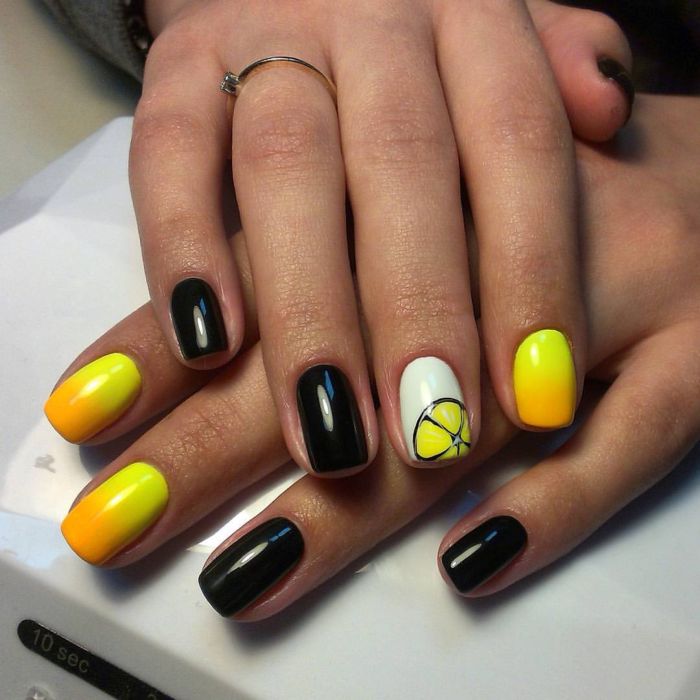 Manicure lessons can now be learned through online resources for free. If there is a thin brush for drawing pictures, a little patience and free time, then You can create a yellow manicure without the help of a master at home: