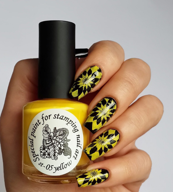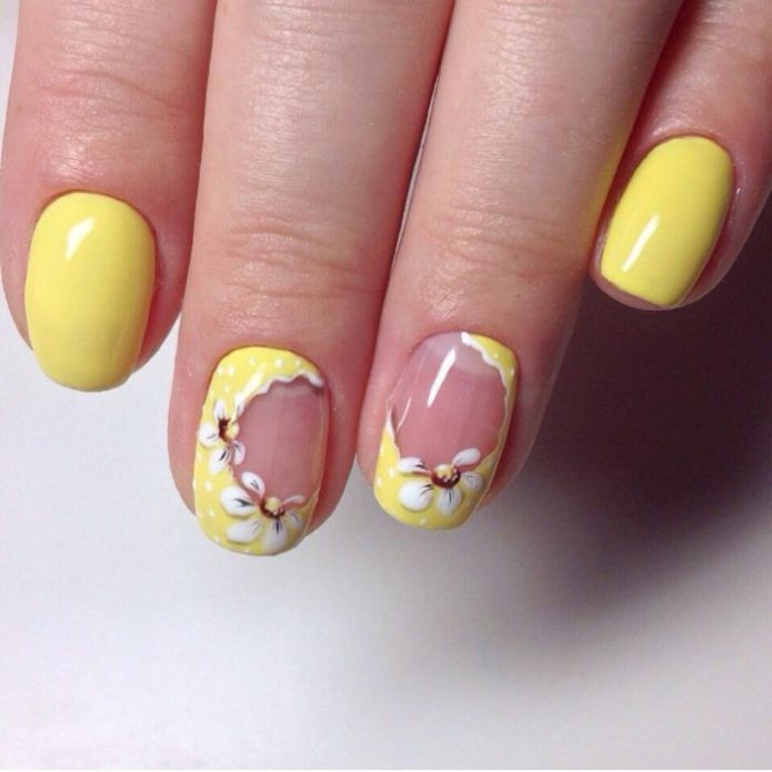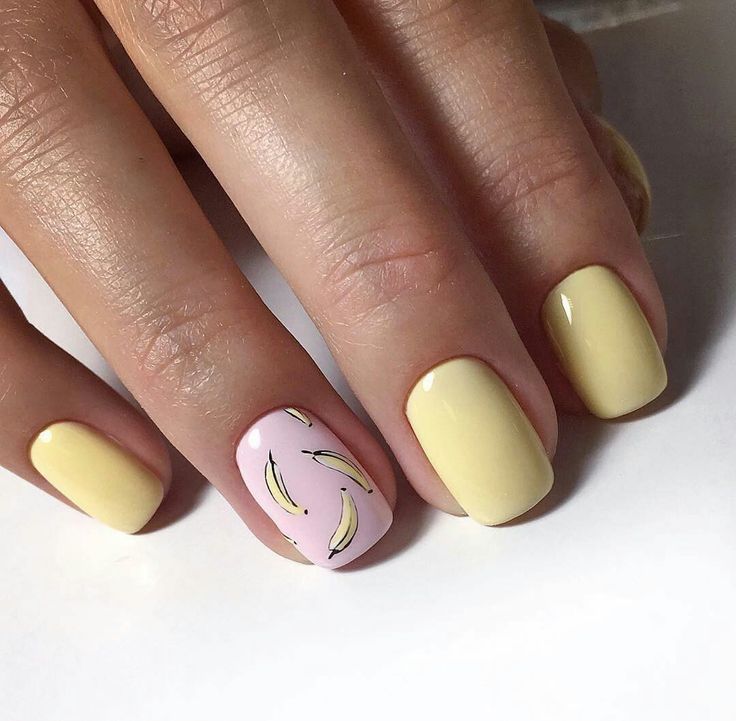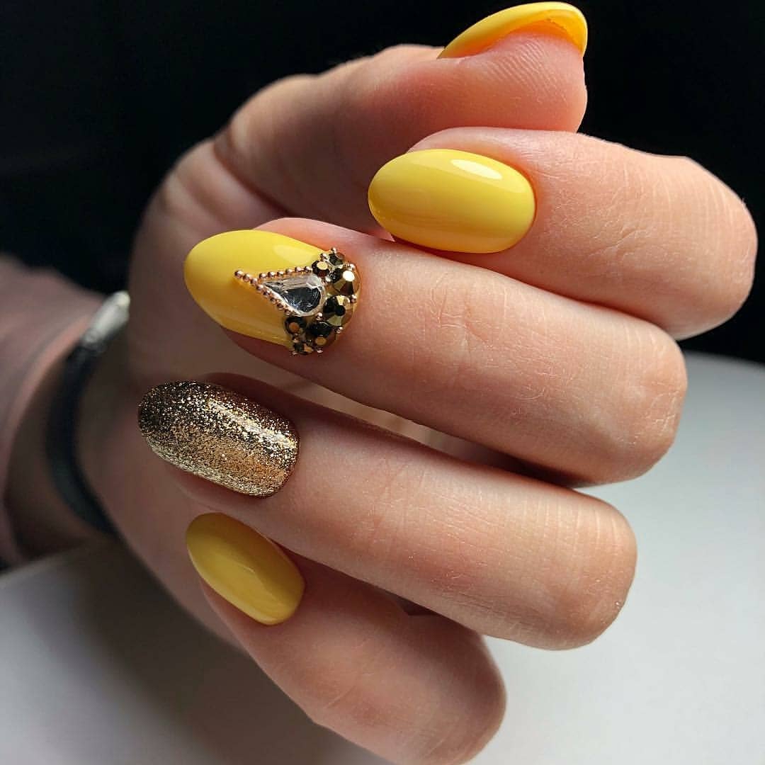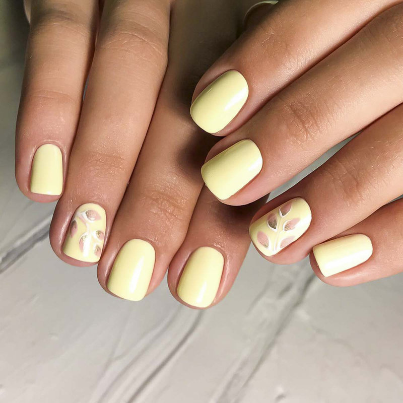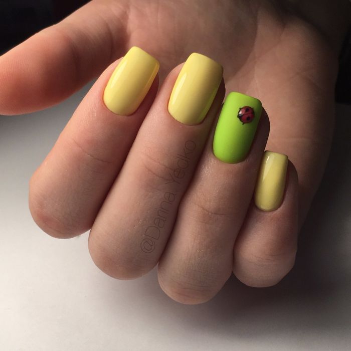 To create a unique and beautiful design on a yellow lacquer, it is very important to take into account its subton. For example, cold shades of yellow as a base color will be perfectly combined with pale blue and light green, but warmer options are best combined with orange, carrot and red.