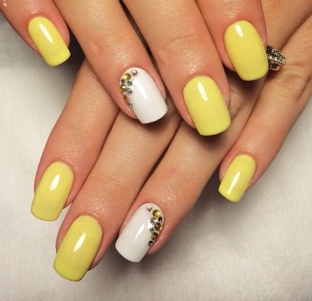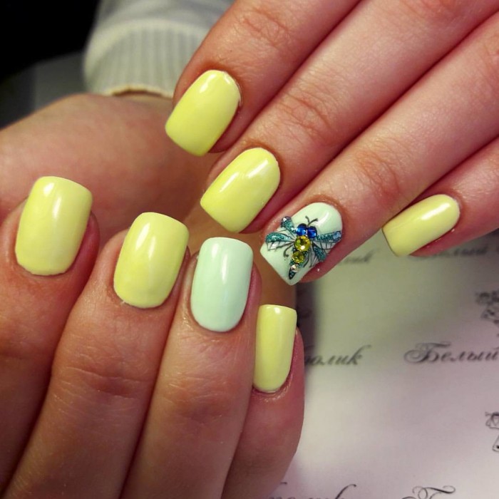 - For everyday life and work, you can combine the pale yellow color that covers all the nails, except for the nameless ones, for example, with a milky or light green. Such a manicure is considered very relevant and popular. Unnamed fingers can be decorated with several small rhinestones to match the varnish.
