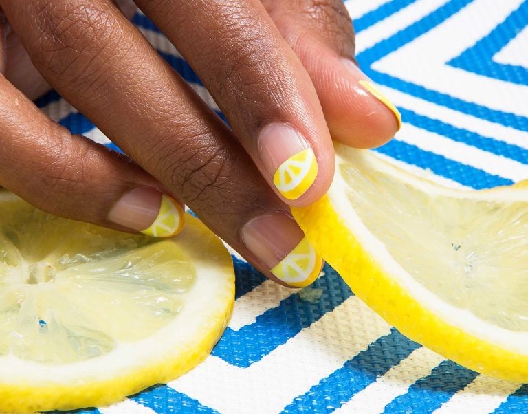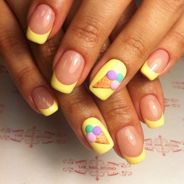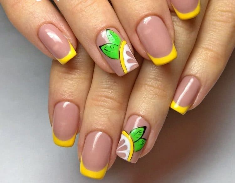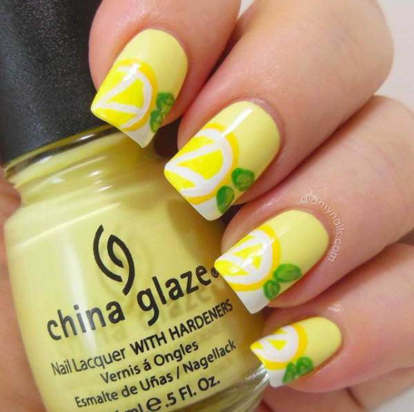 - Very fresh and bright on the nails can look light yellow color with slices of lemons painted on it. Sometimes they draw oranges, mandarins and even melons. It all depends on the imagination and preferences of the client. In addition, juicy fruit manicure can be supplemented with a pedicure in the same style. This nail design will be a great solution for summer holidays on the beach.