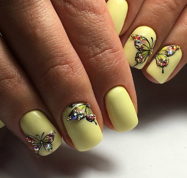 - Dragonflies, painted by hand, look great on a light yellow nail polish, especially if they use Swarovski crystals and miniature bouillons as decoration.