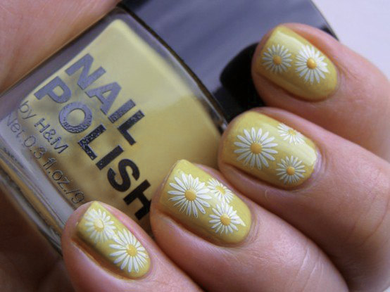 - Chamomiles or white orchids painted by hand and complemented with small golden rhinestones can look great on a soft yellow lacquer.