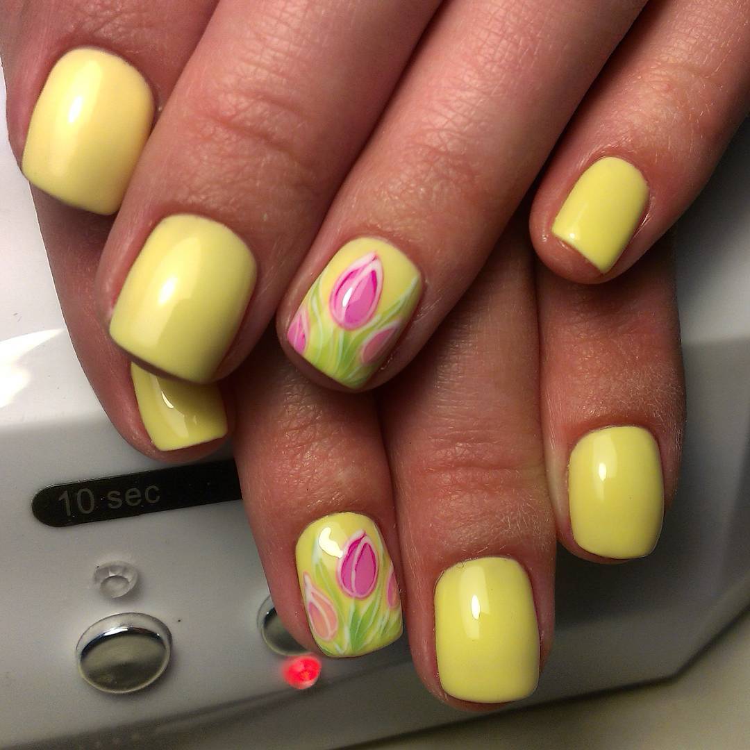 - Creating a gentle spring manicure, you can use the technique of gradient or sputtering and create a white and yellow color on which you can place drop-down tulips pink.