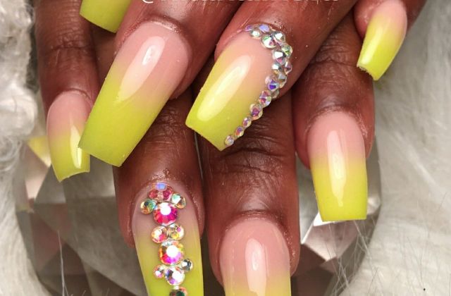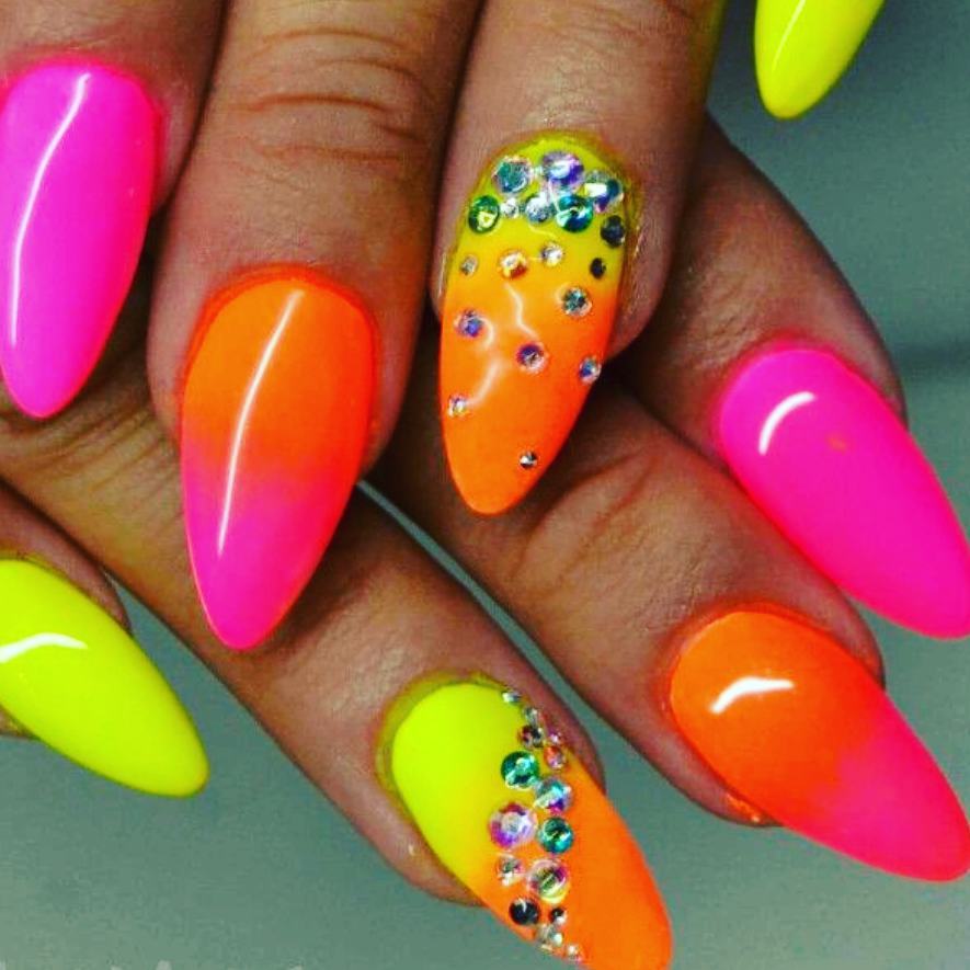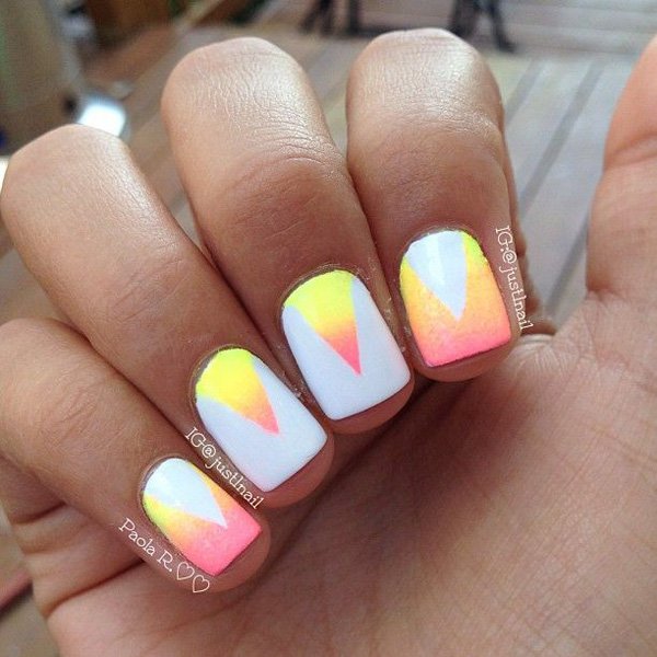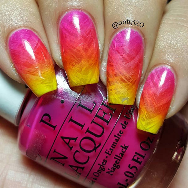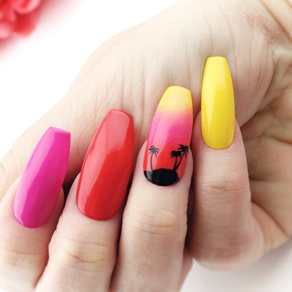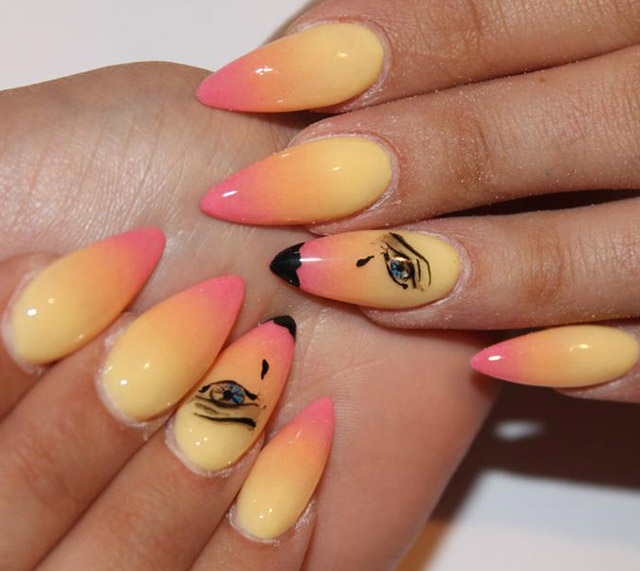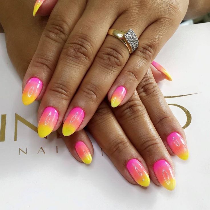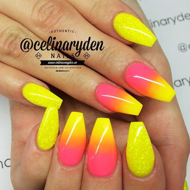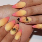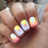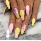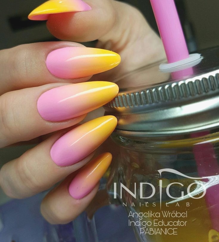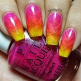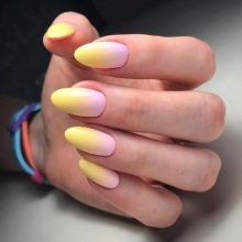 Gradient yellow-pink color can be performed in various variations. The combination of colors is made as a horizontal transition, and vertical. The second option can be combined with the ombra, when the brightness of the tones increases with each subsequent nail. The intensity of the color is regulated not only by brighter tones of yellow and pink, but also by the number of layers of varnish applied. The most fashionable variation is the asymmetrical ombre. This is another opportunity to emphasize a bright individuality and uniqueness.
