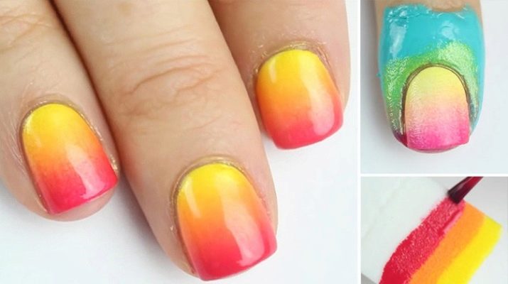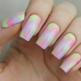There is an alternative way. It is simpler for those who only master the ombre technique. After preparing the working surface, the varnish is not applied immediately. First, all the colors of one nail are mixed and stretched on the palette, then they are transferred to the surface with the help of a damp sponge. Wet sponge simply pressed to the finished template and make an imprint on the working surface.