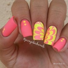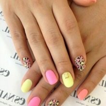 Many fashionistas care about the excessive brightness of the manicure. This problem is easily fixed, even if the design is made in pink and yellow shades. For this you need to make a matte finish. There are several available and simple options. In the first case, you can simply buy a matte varnish.