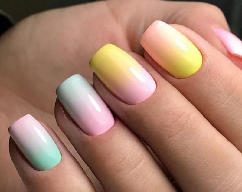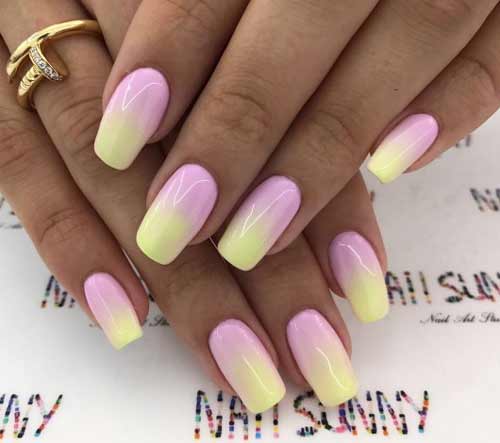 Pink pastel shades give femininity and tenderness to the bow. That is why one of the current options for the ombra this season is yellow-pink manicure. This combination may seem too bright and even flashy at first. But this ombre option in pastel colors looks very gentle and subtle. The pink shade will perfectly support the modern make-up of natural colors, and the yellow one will add a bright touch even to a business bow. A slight contrast of these color schemes will give an additional zest to the image.