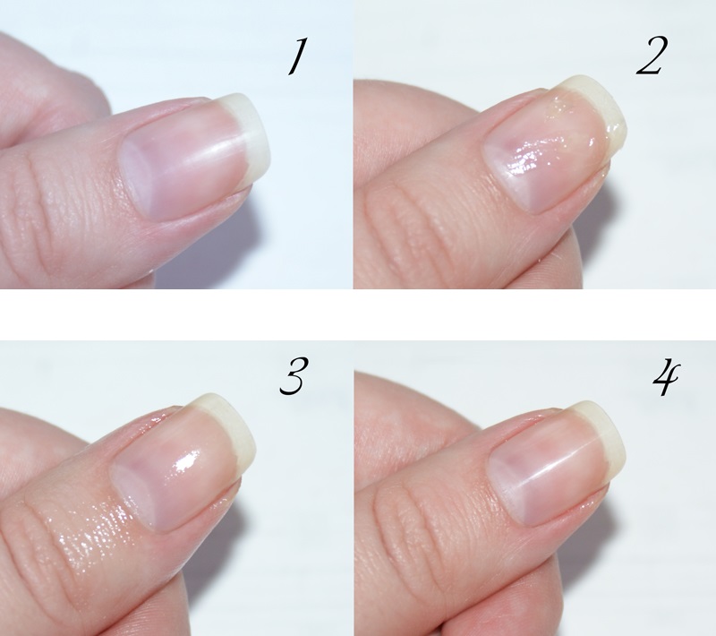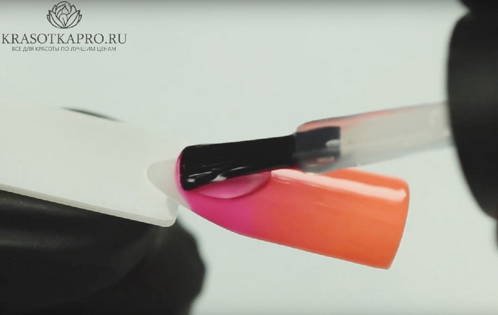 Then, with a brush, gently stretch the lacquer borders so that they maximally merge into one. The same procedure is performed with subsequent layers. The tip of the nail will be the darkest. For greater clarity, you can circle it again at the end. After the varnish has completely dried, a fixative is applied and the cream is removed.