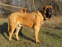 Ears have a low fit and a triangular shape. The body of the animal has a rectangular format, while it is strong and muscular. Belly tight and not tucked up. Chest is characterized by omission and the presence of rounded ribs. Landing tail is located below the croup. It is long, during the activity can rise. Legs straight with oval legs. The fur has a soft and fluffy undercoat, as well as a stiffer guard coat. This mastiff is considered a balanced pet, he is kind and patient in relation to children, friendly to other living creatures in the house.