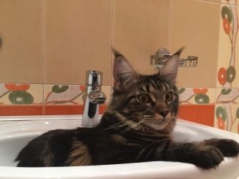 For water at the Maine Coon special relationship. Unlike the rest of the feline, these animals love to swim and are not afraid to climb into the bath, sink or water containers. In addition, cats can watch the flowing water from the tap or shower with a spellbound look for a very long time, and in some cases they are happy to take water procedures with their owner.