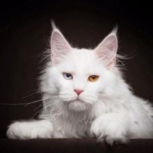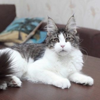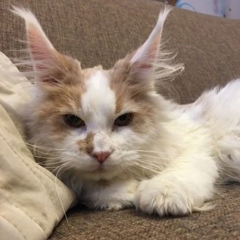 It should be said separately about the white solid. In any case, the white color of Maine wool is not a color, but a lack of pigment. Snow-white kittens may sometimes have darker specks on the face, disappearing as the animal grows. White Maine Coons are unpretentious in care, however, they may be deaf. That is why it is better to get them from famous and experienced breeders.