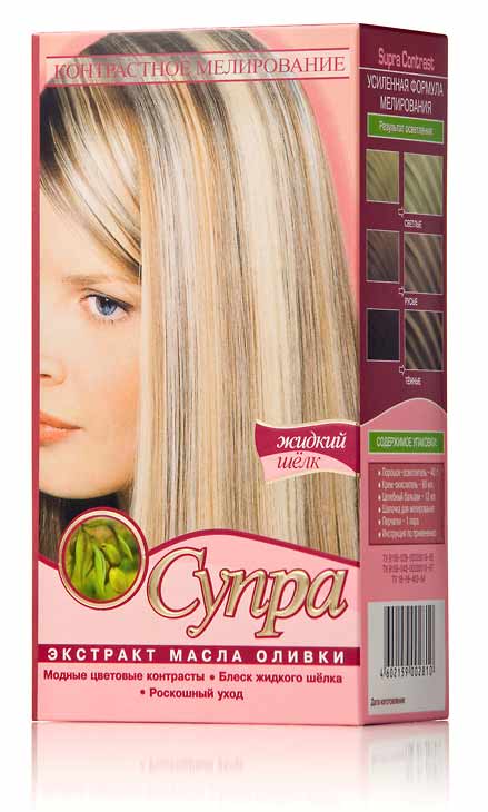 - "Supra". It is also called white henna. It is great for brightening blond hair, but not suitable for use on naturally dark curls. The composition contains natural ingredients, so the paint does not have an intense effect. Lightening occurs on one or more tones. This composition is perfect for California technology, because it allows you to create a smooth transition. To remove the yellowness on the strands, it is necessary after staining to use toning.