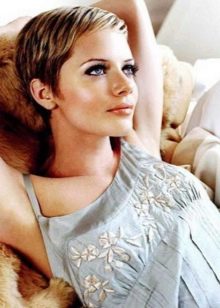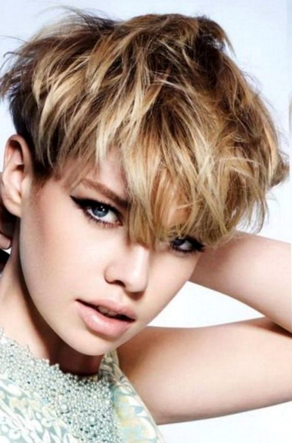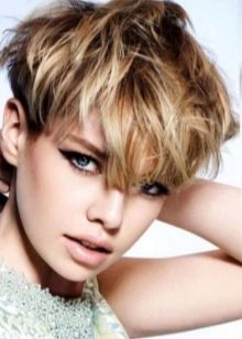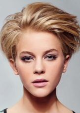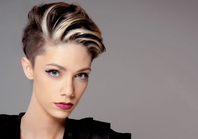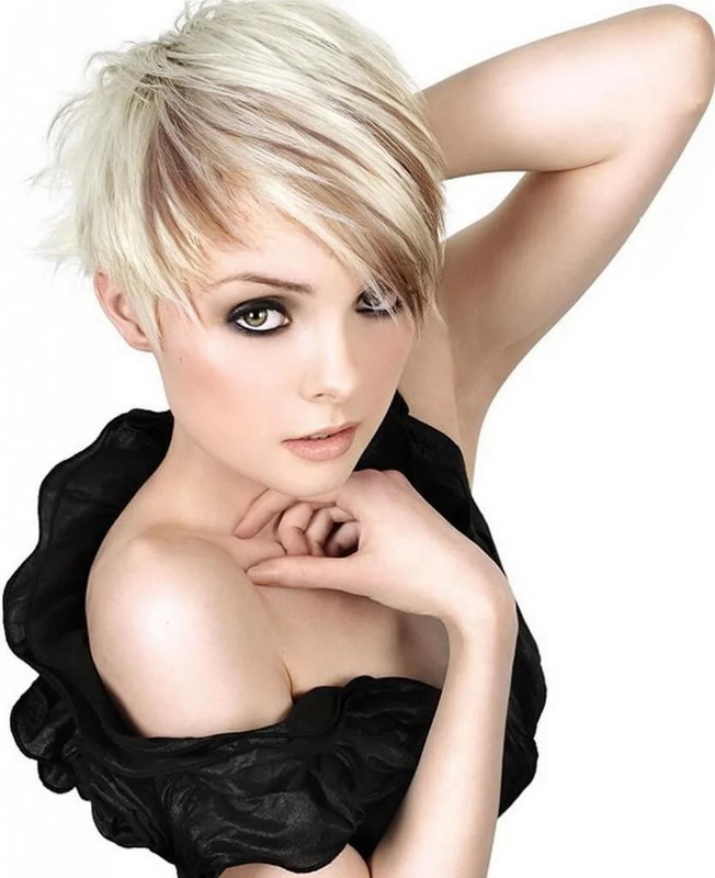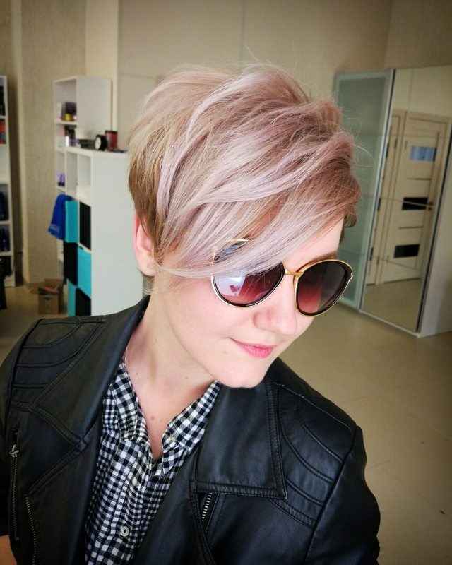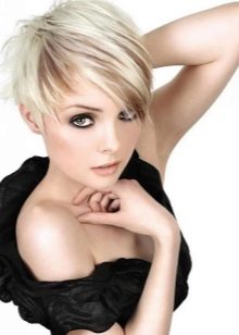 The short pixie type haircut will sparkle with new colors, if you dilute it with several light strands in front (above the line of the forehead). Especially attractive and boldly this solution will look on the background of dark blond hair, shaved temple and the volume of hair in the area of the crown.