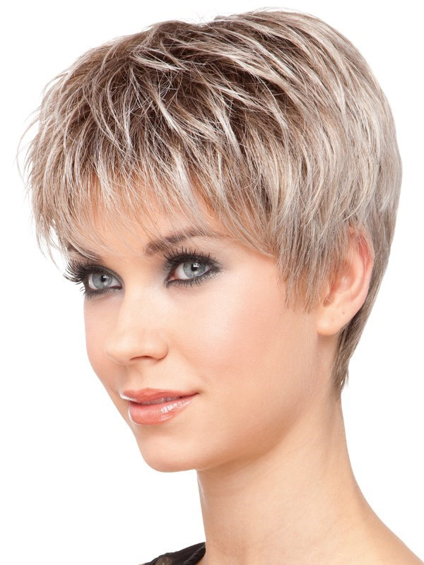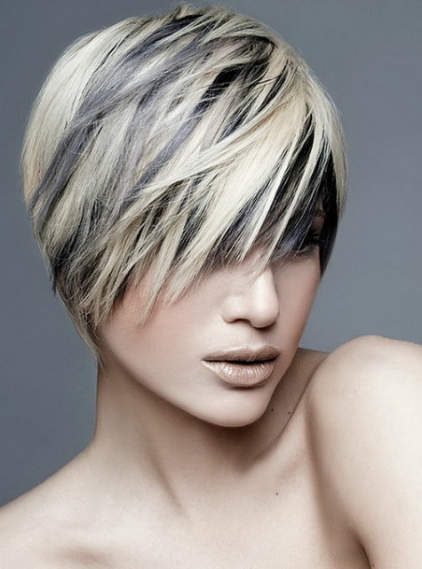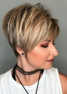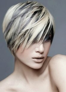 Bold and original on a female short blond haircut without a bang will look discreet strands of chocolate shades, supported by dull gray-blue stripes.