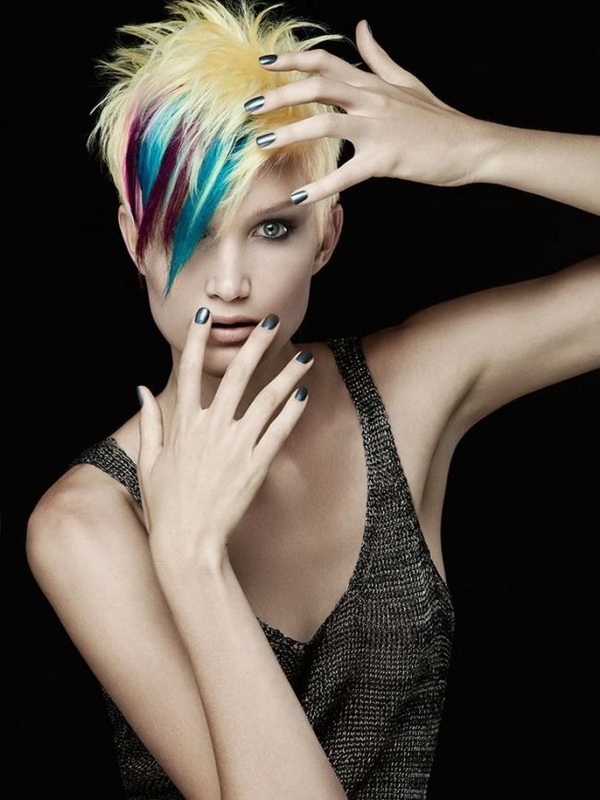 Modern girls who explore fashion trends often choose creative highlighting using bright colors. For example, short black hair with elongated front strands really looks fantastic blue or neon blue dye.
