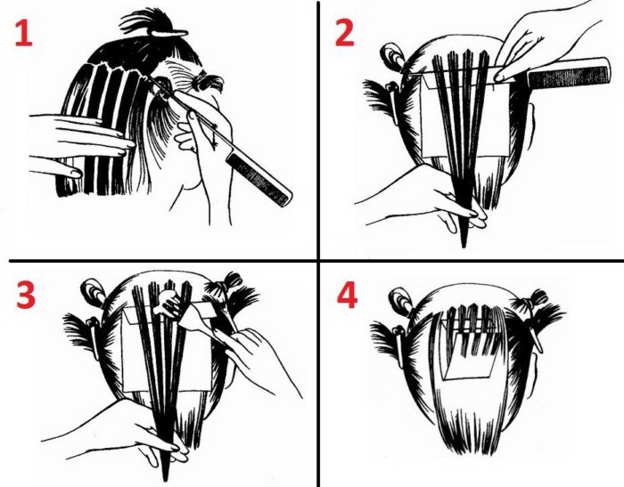 - Comb and cut the haircut into certain parts making even partings. It will be necessary to select the central parietal, lateral, occipital right and left halves. The remaining strands will need to stab clamps.