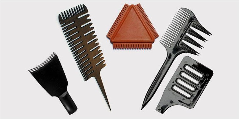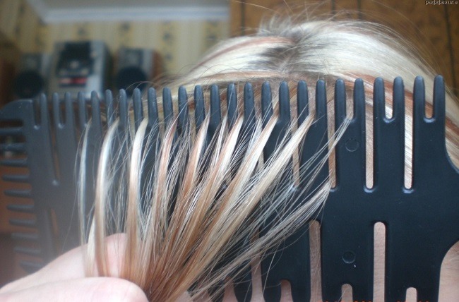 - Comb. Paint over the curls using a comb with rare teeth, but in no case should it be metallic. The technique can be used for hair of any length. The composition is applied over the hair, on the parting, and so in several layers, if necessary.