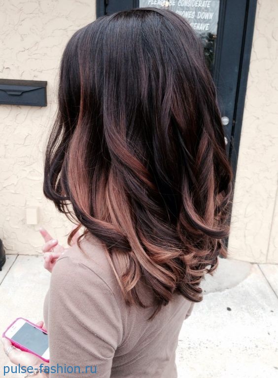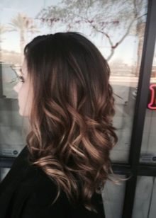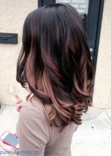 Quite a popular look for dark curls, which involves coloring individual strands with a harmonious and smooth color transition.