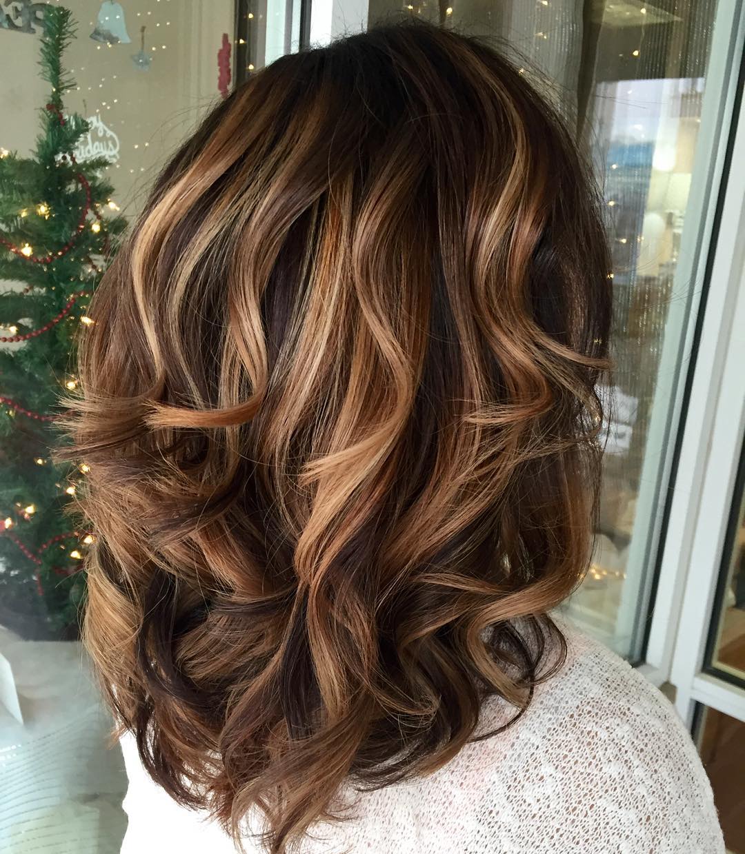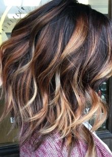 Highlighting on dark hair of medium length allows the master to vary not only the selected light shades and their number, but also the width of the colored curls, their placement in the total volume of the hair and against the background of the existing haircut.